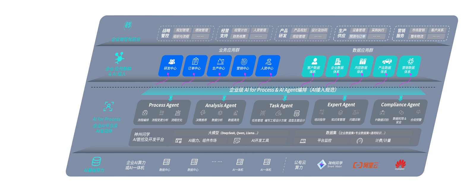 端到端的一站式AI工作空间深度融合了从企业战略规划到日常经营的全流程业务板块,,,,定向解决车企内部领域多、、部门多、、、、链条长、、、场景碎片化等难题,,支持车企快速构建以AI为核心的生产力写作体系,,实现任务执行与AI能力的无缝集成与交互