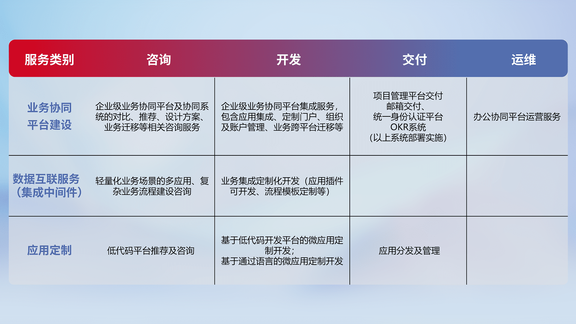针对钉钉、、、企微、、、、IDaas等平台级产品提供产品的规划、、、、方案、、、交付、、定制化开发等服务,,,,实现如统一协同办公、、智能客户服务、、、、混合会议管理、、智能数据查询、、、、等业务场景,,实现数字化转型。。